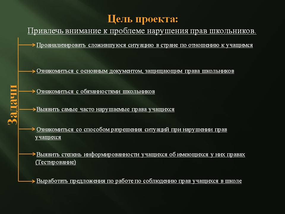 Цель проекта: Привлечь внимание к проблеме нарушения прав школьников. Ознакомиться с основным документом, защищающим права школьников. Выявить самые часто нарушаемые права учащихся. Проанализировать сложившуюся ситуацию в стране по отношению к учащимся. Ознакомиться с обязанностями школьников. Ознакомиться со способом разрешения ситуаций при нарушении прав учащихся. Выявить степень информированности учащихся об имеющихся у них правах (Тестирование). Выработать предложения по работе по соблюдению прав учащихся в школе. Слайд 3 из презентации «Нарушение прав ребёнка в школе».